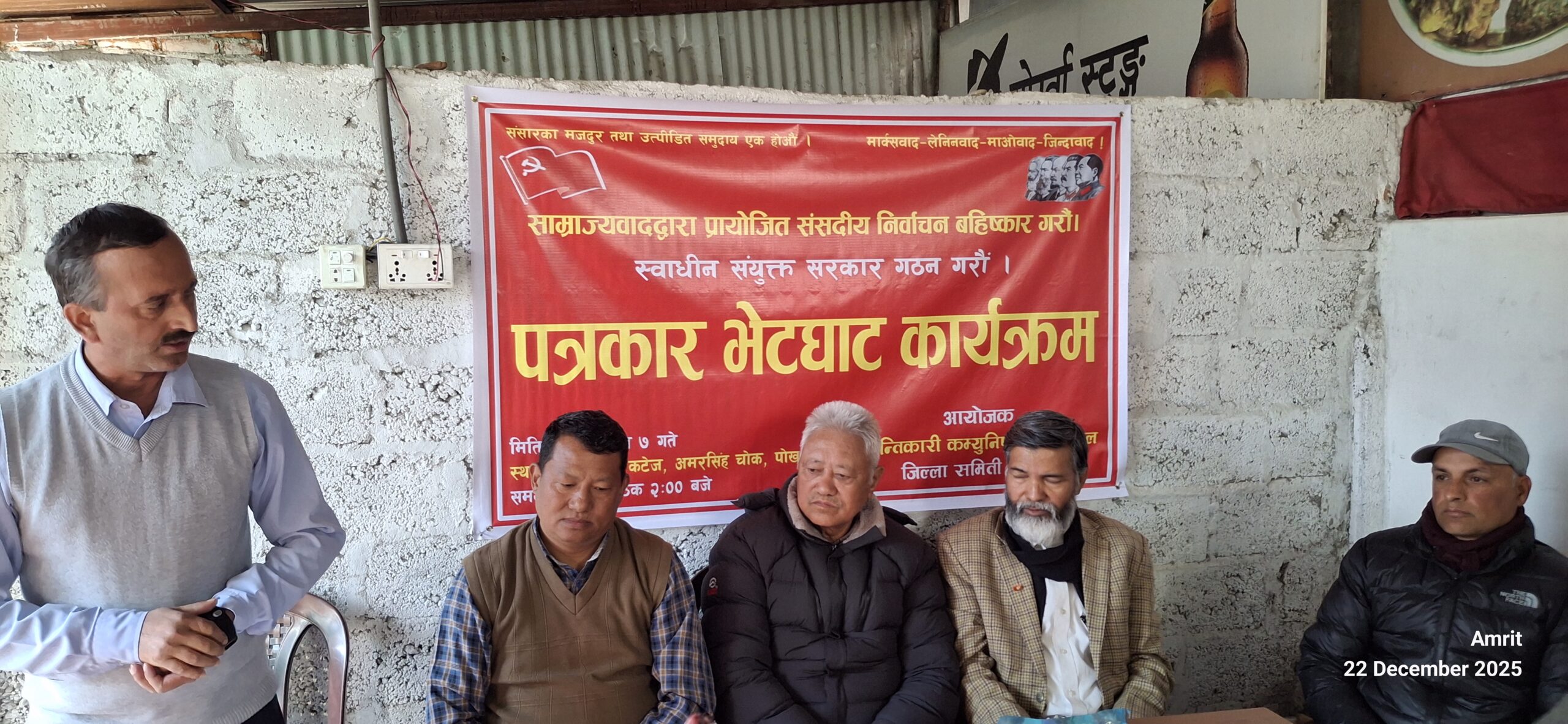 पोखरा, पुस ७। क्रान्तिकारी कम्युनिस्ट पार्टी नेपालका प्रमुख नेता रामसिंह श्रीषले साम्राज्यवादद्वारा प्रायोजित संसदीय निर्वाचनलाई “जनविरोधी षड्यन्त्र”को संज्ञा दिँदै त्यसको कडा बहिष्कार नगरे देश र जनताको भविष्य गम्भीर संकटमा पर्ने[...]
